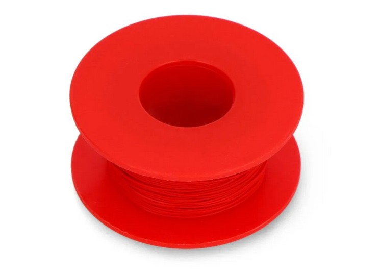 Tuote 103145. Räppilanka punainen, kiertoliitoslanka, wire wrap lanka. Ohut n. 0.25mm (30AWG) yksisäikeinen kiertoliitoksiin (wire wrap) tarkoitettu lanka. Käytetään myös hyppylankana piirilevyissä jne... Maksimi käyttölämpötila 105 astetta. Myydään metreittäin. Kelassa n. 50m.