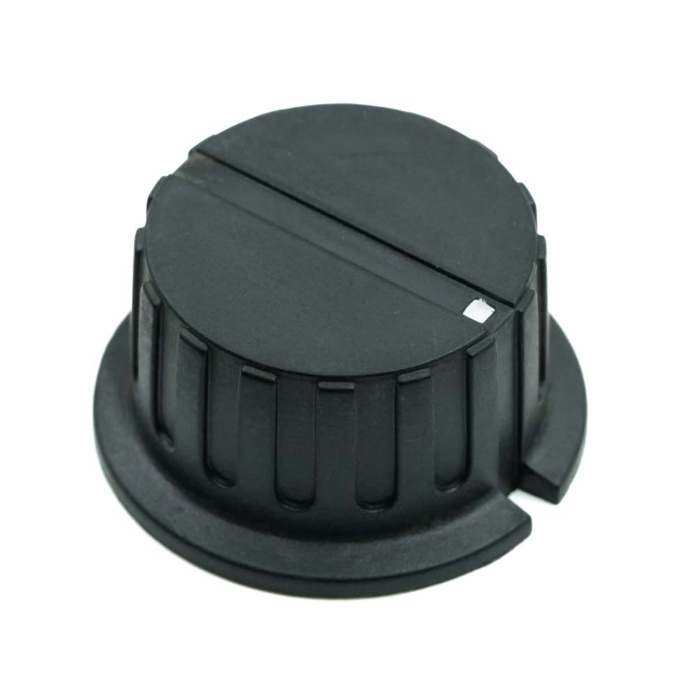 Potentiometrin nuppi, musta, bakeliittia - malli 3D. Metallinen sisäholkki, ruuvikiinnitys sivusta. Valkoinen osoitintäplä + lovi, max 6.4 mm akselille.
