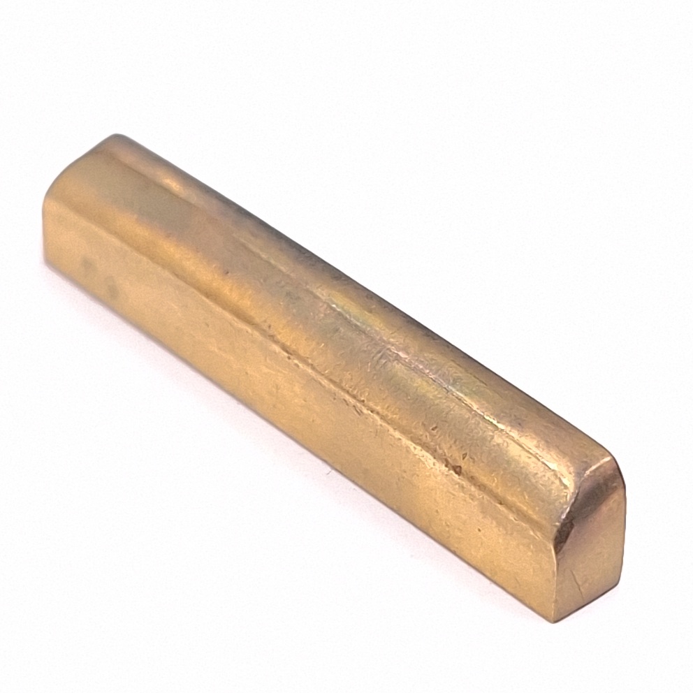 Tuote 113390. Satula-aihio, messinki LP style 43.0 x 8.4 (7.8) x 5 mm. Ei kieliuria. Leveys 43mm, korkeus keskeltä 8.4, korkeus päistä 7.8mm, paksuus 5mm. Messinkinen satula-aihio.