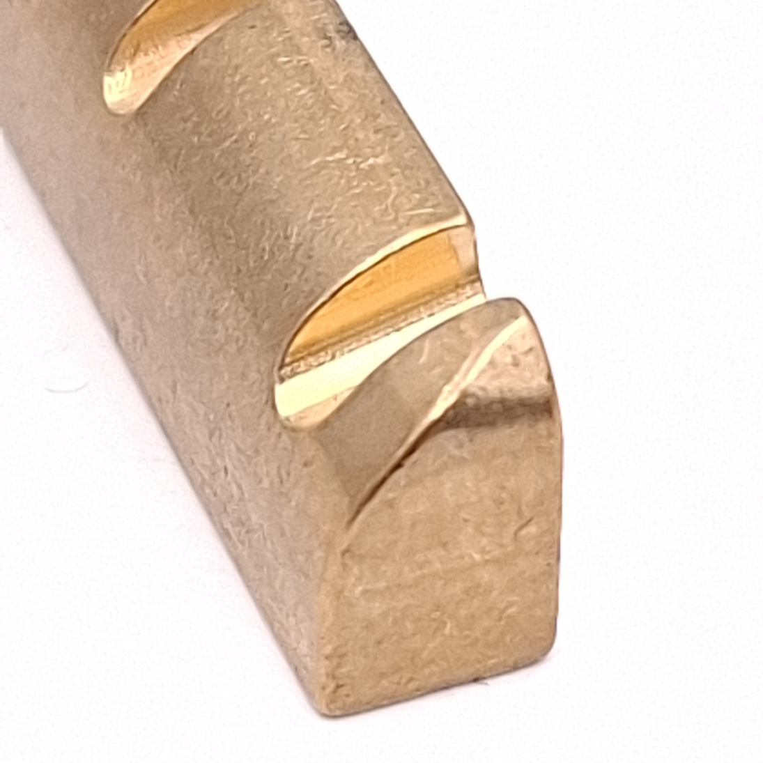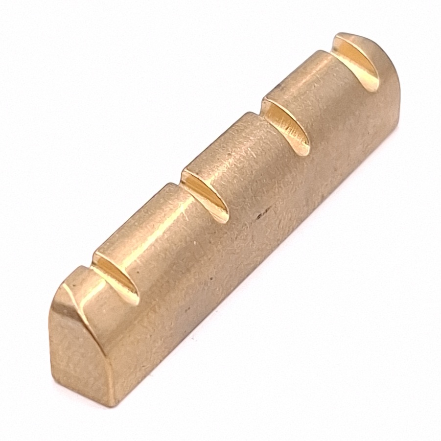 Tuote 102988. Messinkisatula 4 -kieliselle bassolle. Brass saddle to 4 -string bass. Kaareva ja loivasti viistottu, curved and slightly tapers towards