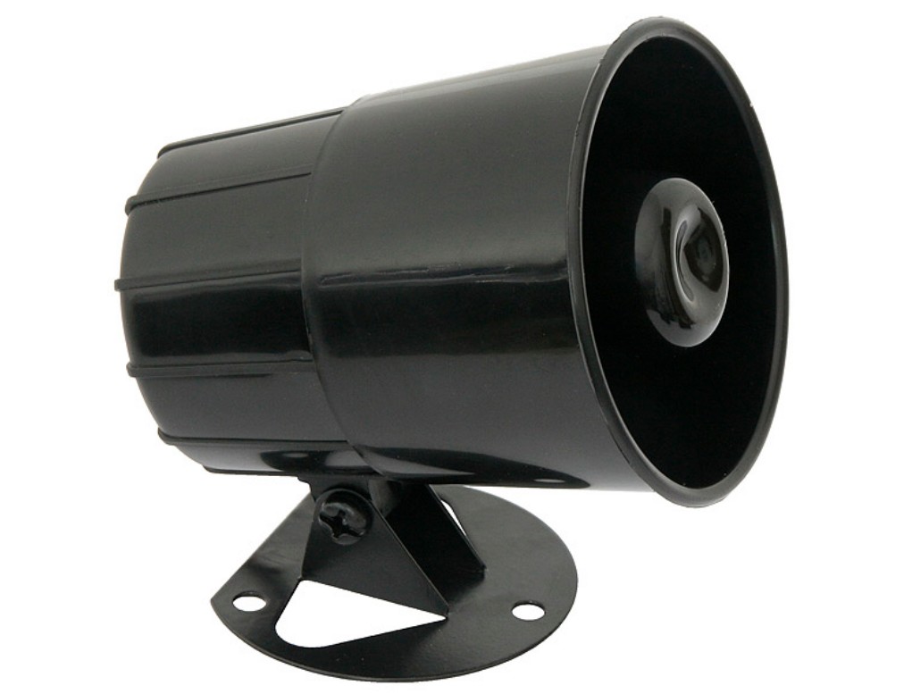 Tuote 111026. Sireeni roiskevesisuojattu 8 - 16VDC voimakas nouseva ja laskeva ääni. Todella kauhistuttavan kova UI ... Ui ... Ui ... ääni. Hyvä varashälyttimen sireeni esim. moottoripyörään, veneeseen, autoon jne ... Torven halkaisija n. 105 mm, pituus n. 110 mm. Kiinnitysrauta. Virrankulutus n. 1.2A / 12VDC.
