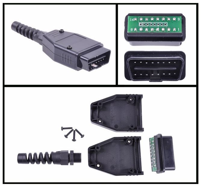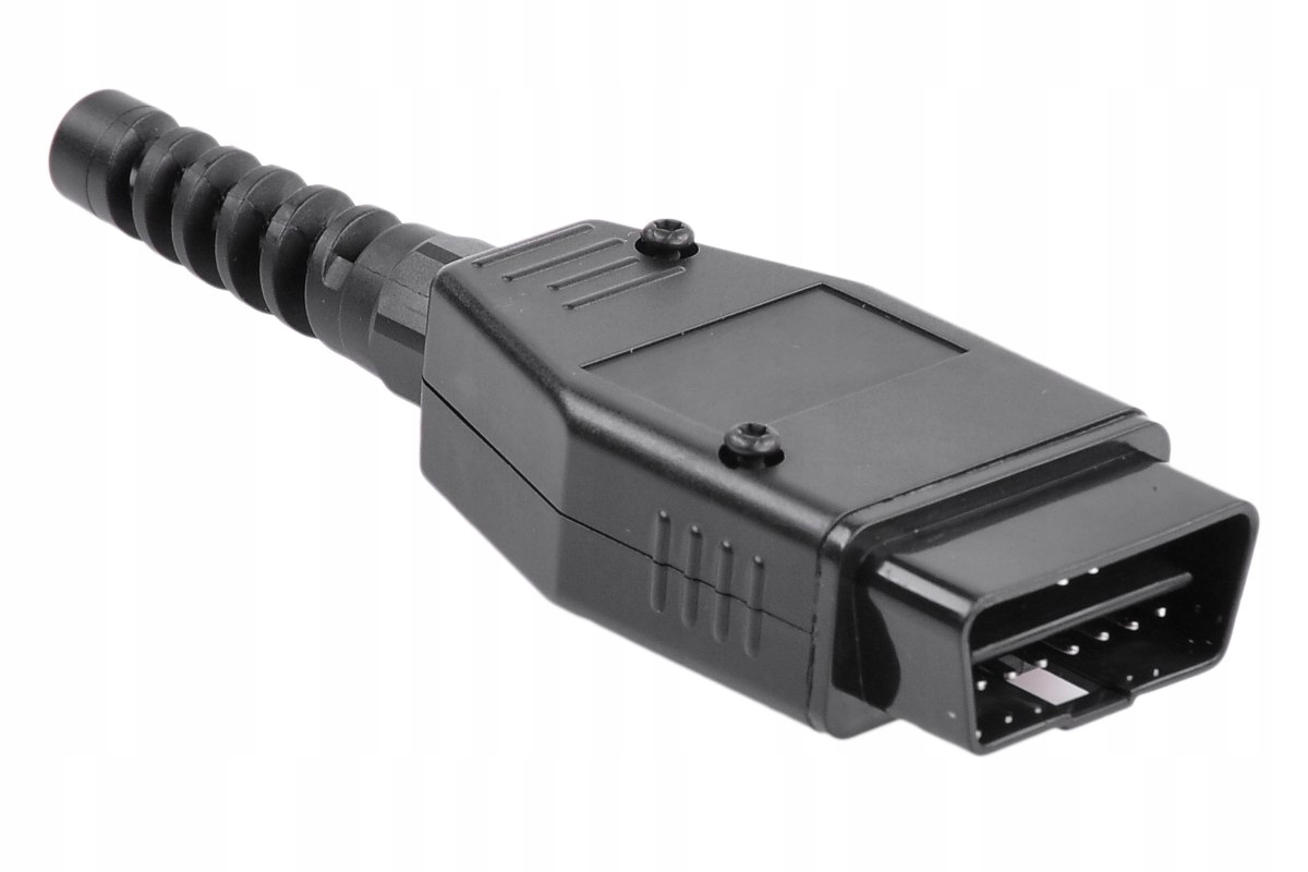OBD2 pistoke, uros. OBD-II -sarjan pistoke. Pistoke sisältää kuoret, taivutussuojan ja 16 pinniä. Juotettavat pinnit.