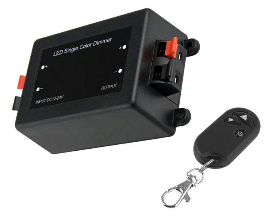 LED RF himmennin 12V 6A (8A) malli. Soveltuu mm. LED nauhan himmentämiseen langattomasti ja moneen muuhun käyttöön (PWM säätö). "Portaaton" himmennys. Käyttöjännitteeksi 12VDC reguloitu verkkolaite joka jaksaa syöttää sovellukseesi tarvittavan virran, himmentimen kautta kulkeva maksimivirta 12V:in jännitteellä on 6A, hetkellisesti jopa 8A. Pikaliittimet kummallakin puolella, punainen on plus ja musta miinus. Kantomatka joitakin kymmeniä metrejä, riippuu tietenkin asennuspaikasta ja seinämateriaaleista mitä on ohjaimen ja vastaanottimen välillä. Mitat. 110 x 56 x 34 mm. Paino n. 70g. Lähetin 58 x 30 x 12 mm. Paino n. 20 g. Lähettimessä paristo mukana. LR 27A.