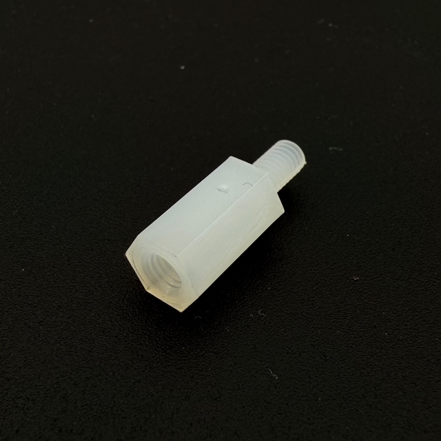 Muovinen jatkomutteri M3, korotus 20mm korotus 20mm ulkokierre 3mm ulkokierteen pituus 6mm sisäkierre 3mm