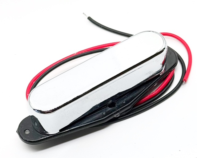 Telecaster -tyylinen keraaminen kaulamikrofoni. Kromattu metallikuori, korkeus 14mm. Mukana ruuvit ja jouset. Punainen johto = HOT, musta johto = GND.