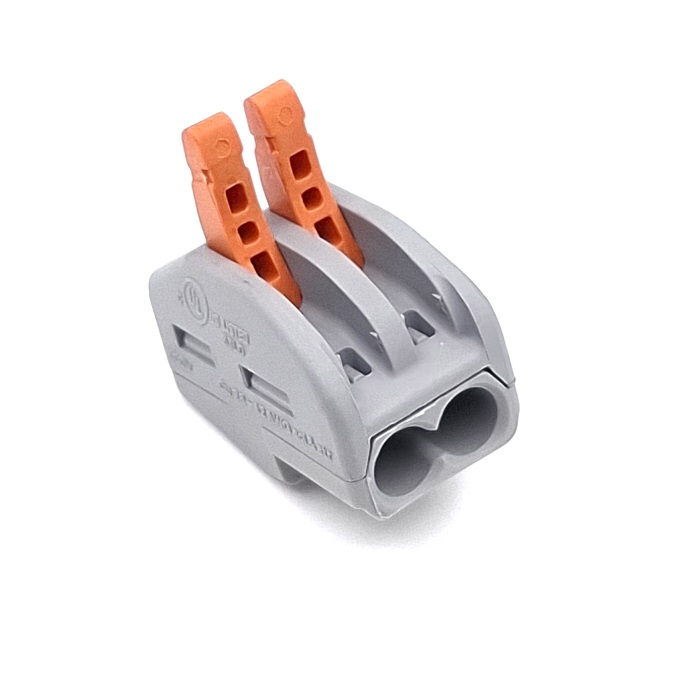 Pikaliitin jousikuormitteisilla vivuilla, 450VAC 24AAC kahdelle johtimelle. Toimii sekä yksisäikeiselle että monisäikeiselle johdolle. Johdon paksuus 0.2 ... 2.5 mm2. Rasialiitin / vipuliitin.