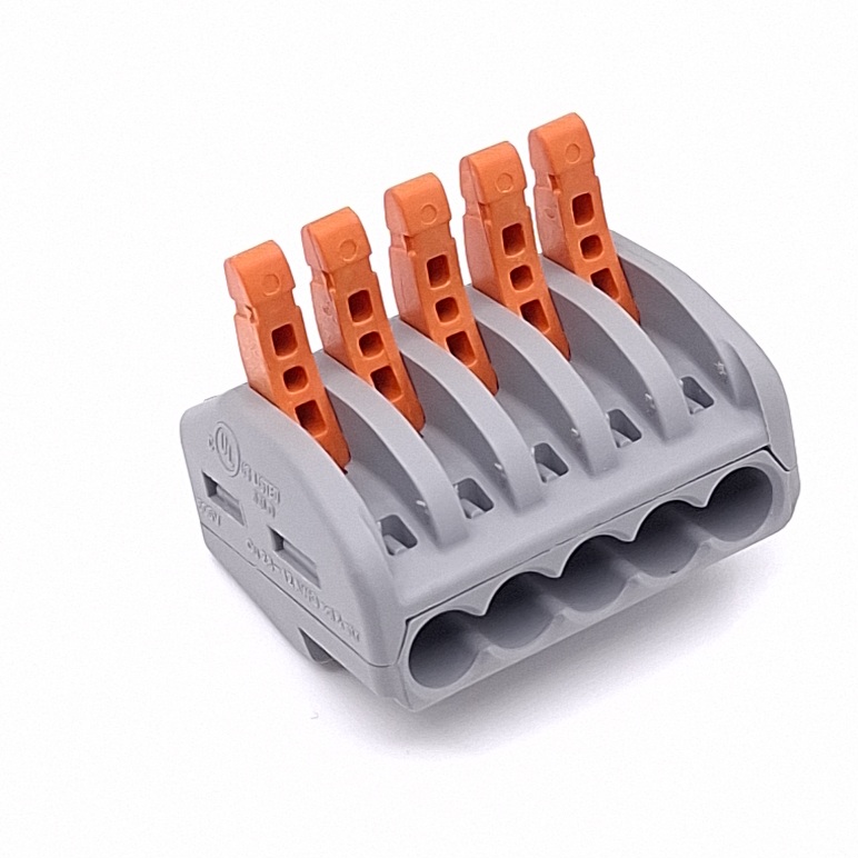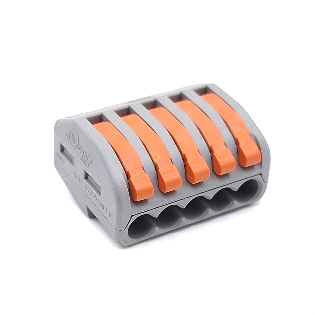 Pikaliitin jousikuormitteisilla vivuilla, 450VAC 24AAC viidelle johtimelle. Toimii sekä yksisäikeiselle että monisäikeiselle johdolle. Johdon paksuus 0.2 ... 2.5 mm2.