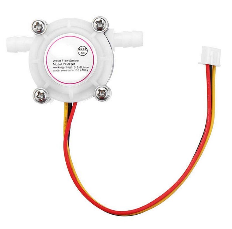 Virtausanturi vedelle 0,3 - 6 l / min. Tällä anturilla voit helposti mitata nesteiden (veden) virtauksen. Anturissa on 7 mm: n liitin molemmin puolin, joten se on helppo liittää 6 mm: n letkuun. Anturin lähtö tuottaa 98 pulssia sekunnissa ja pulssisuhde on noin 50% kutakin minuutissa kulkevaa nestelitraa kohti: Q [L / min] = fpulssi [Hz] / 98.
