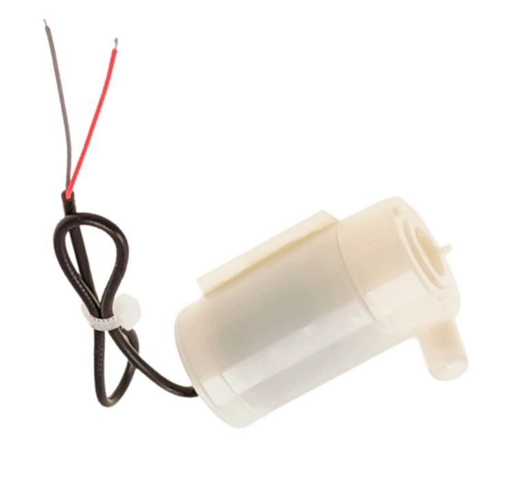 Vesipumppu 3V - 6V lähtö sivuun. Imee pohjaosasta, ei suodatinta, lähtöliitäntä 7.5 mm ulkohalkaisija. Nostokorkeus joitakin kymmeniä senttimetrejä, riippuu mm. käyttöjännitteestä, jos käytetään esim. 6V jännitteellä voi nostaa jopa 70 cm korkeuteen ja ylikin.