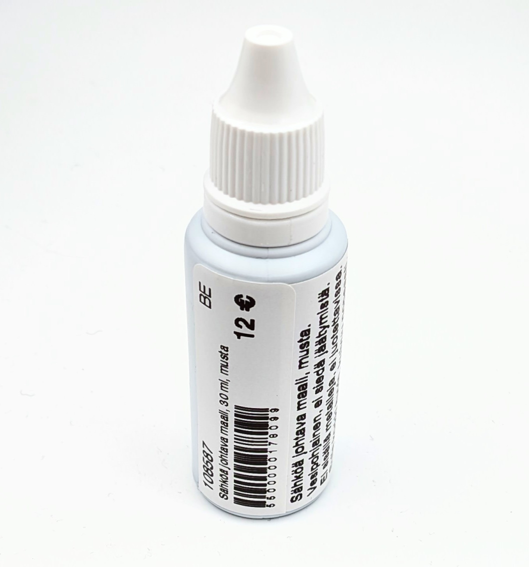 Sähköä johtava musta maali, 30 ml, häiriösuojauksiin, RF-suojaukseen. Vesipohjainen, ei sisällä metalleja, ei siedä jäätymistä, ei tinattavissa.