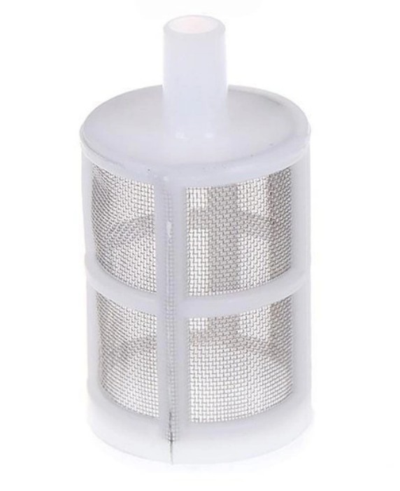 Pieni sihti/suodatin sisähalkaisijaltaan n. 7 mm letkun päähän, teräsverkko ympärillä. Päästää nesteen tosi hyvin läpi kun ei ole itse suodatinainetta tuolla sisällä hidastamassa. Tarkoitettu pitämään isommat roskat pois nesteen imupuolelta. Koko n. 27 x 40 mm. Ulostuloputken ulkohalkaisija n. 7mm.
