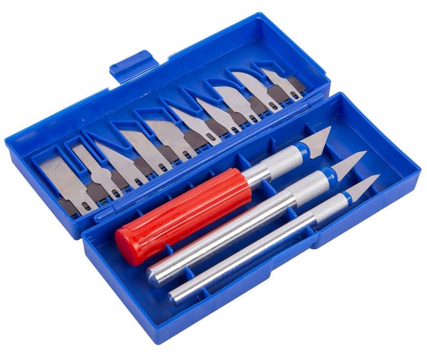 Askarteluveitsisetti kätevässä muovilaatikossa.