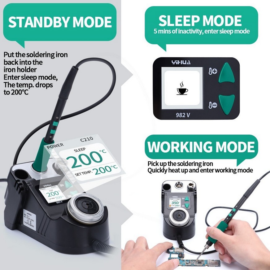 - Nukkumis-/lepotila: Asemaan paikoilleen asetettu juotin siirtyy lepotilaan (~200 °C) kun sitä ei käytetä.
