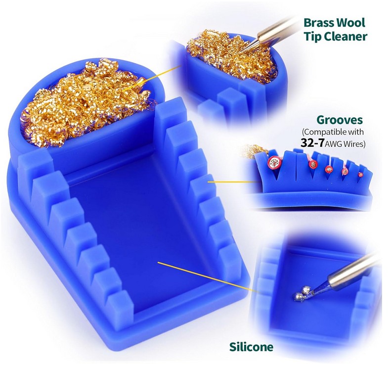 - Integroitu messinkivillapuhdistin, joka puhdistaa juotoskärjet nopeasti ilman suurta lämpöhävikkiä