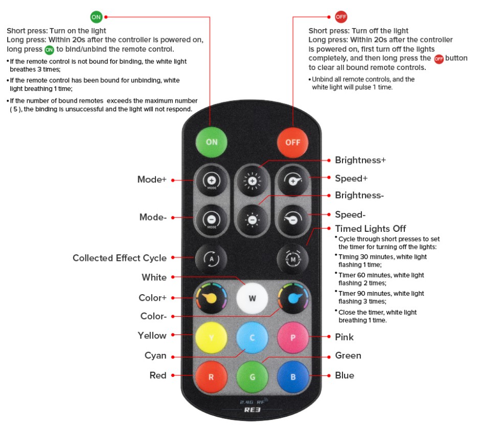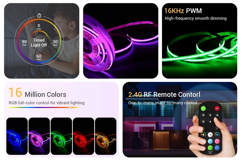 Kolmikanavainen PWM LED-ohjain, joka ansiosta RGB LED-valaistuksen säätö on tasaista ja tarkkaa. Korkeataajuinen 16kHz himmennystekniikka poistaa välkkymisen, ja kirkkaudensäätö on pehmeää. 2,4 G RF-kaukosäädin tarjoaa jopa 30 metrin langattoman ohjausetäisyyden, ja sisäänrakennetut dynaamiset valon tehosteet tuovat vaihtelua valaistukseen.