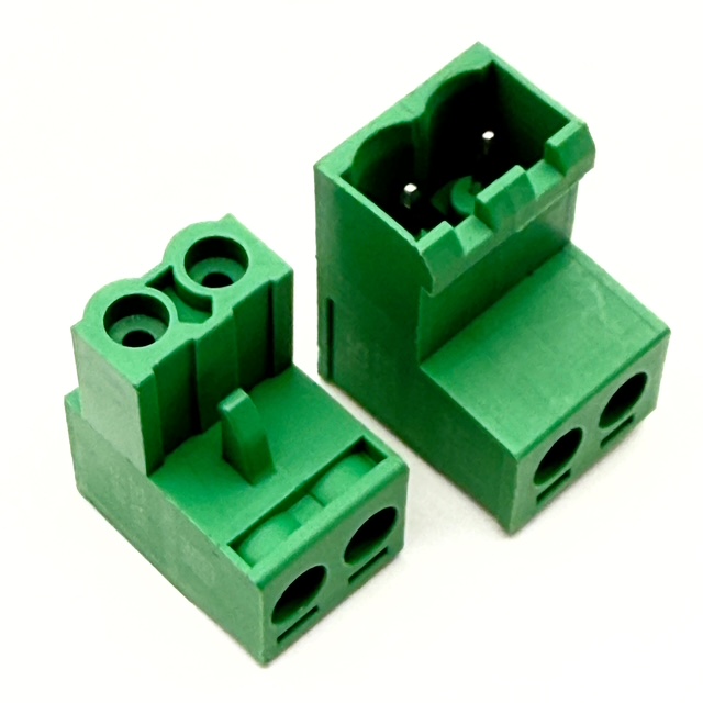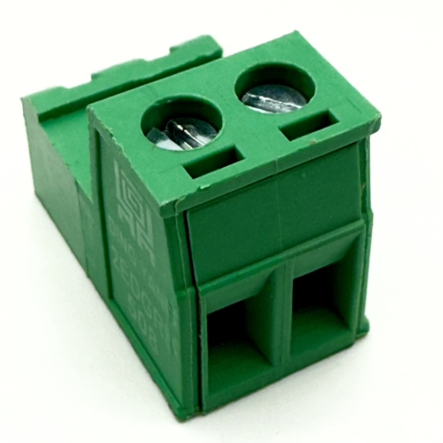2-napainen 5.08 mm irrotettava liitinpari, joka mahdollistaa johdotuksen ilman juottamista (ruuvikiinnitys).