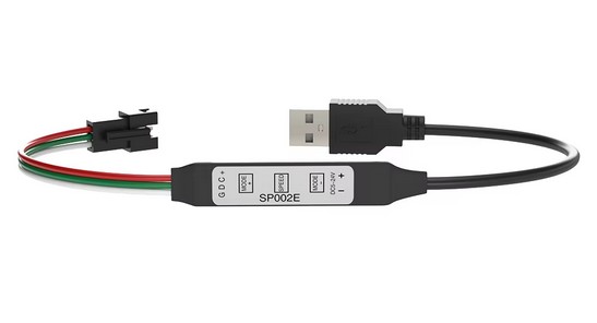 Kolmepainikkeinen ohjain (MODE+, MODE-, SPEED), jossa toisessa päässä USB A -urosliitin virransyöttöön ja toisessa päässä JST SM 3pin urosliitin LED-nauhalle.