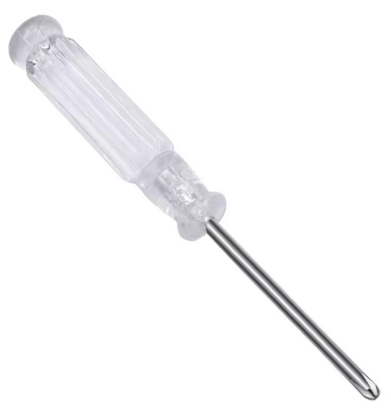 Pieni Philips ristipää ruuvimeisseli, PH2. Ruuvimeisselin kokonaispituus 120mm. Kädensija kovaa, läpinäkyvää muovia.