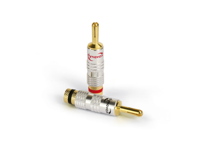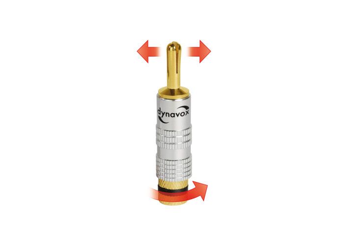 Dynavox-banaaniliittimet haarukkakiinnityksellä. Takaa ruuvattava laajennustappi laajentaa liitintä, mikä takaa kestävän ja tiukan kontaktin. Liittimeen voi kytkeä enintään noin 4,5 mm halkaisijaltaan olevia kaapeleita, jotka kiinnitetään kahdella ruuvilla. 24K kullattu. Neljän kappaleen setti.