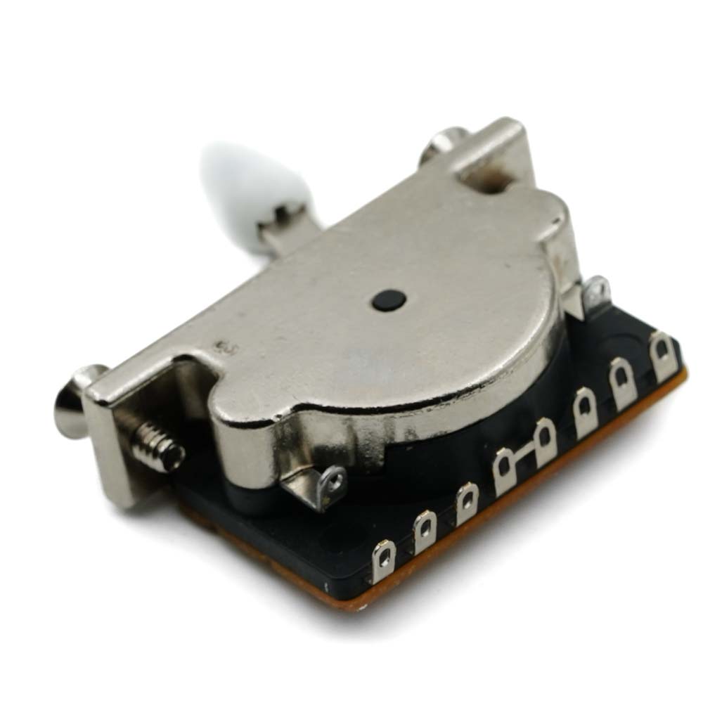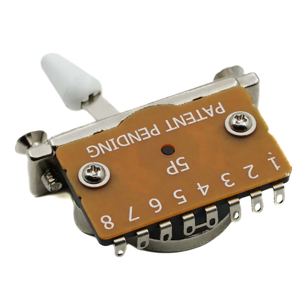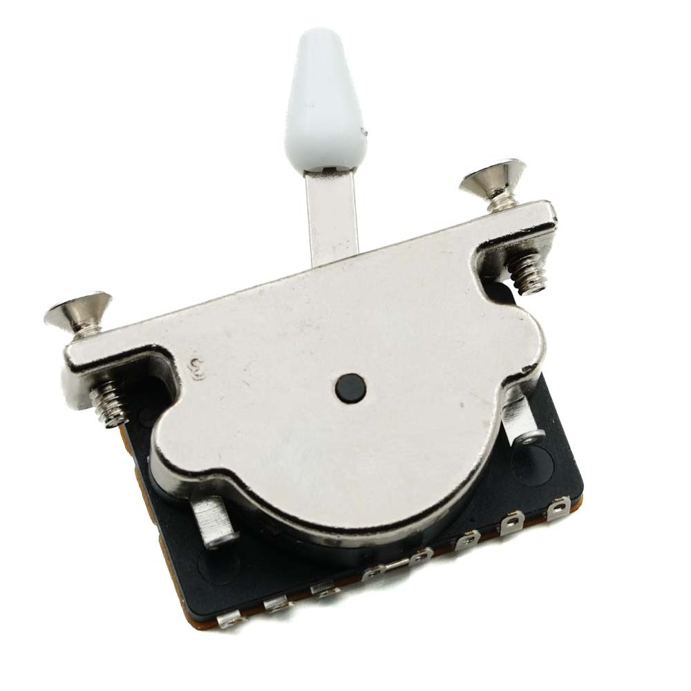 Laadukas ja tukeva valurunkoinen haulikontakteilla toteutettu 2 x 5 -asentoinen strato mikinvaihtokytkin. Kiinnitysruuvien kierteet #6-32, ruuvit ja valkoinen nuppi mukana. Kiinnitysruuvien jako n. 41 mm.