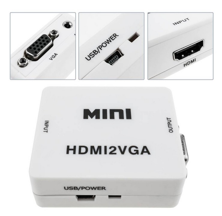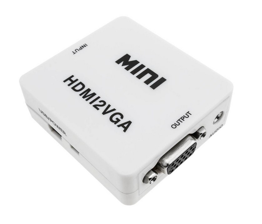 HDMI - VGA muunnin, muuttaa HDMI signaalin VGA muotoon. Virta USB liittimen kautta, Audio out 3.5mm jakki. Mahdollistaa HDMI-ulostulolla varustetun laitteen liittämisen näytölle, jossa on VGA-liitäntä. Power in USB liittimen kautta. HUOM !!! Ei toimi toisinpäin. IN on HDMI naaras, OUT on VGA naaras, virta IN on mini USB (USB/mini USB johto mukana).
