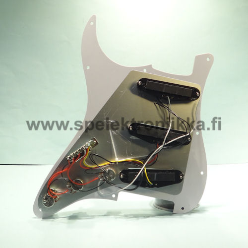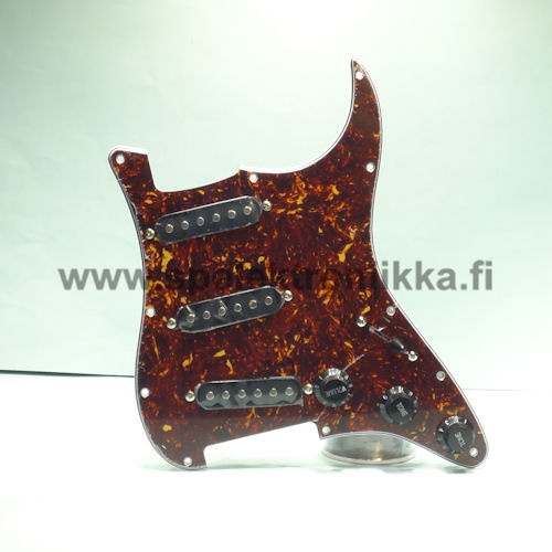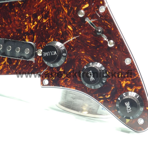 Tuote 101284. ST -tyylinen 3xsingle VALMIS30 Tortoise/W/B/W pleksi 4PLY. Valmiiksi koottu pleksilevy, missä 3 kpl yksikelaista mikrofonia, potikat, nupit, 5 -asentoinen kytkin.