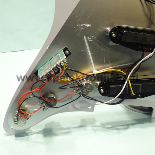 Pre-wired pickguard assembly includes 3 single coil pickups, pots, knobs,5 -way switch with knob.