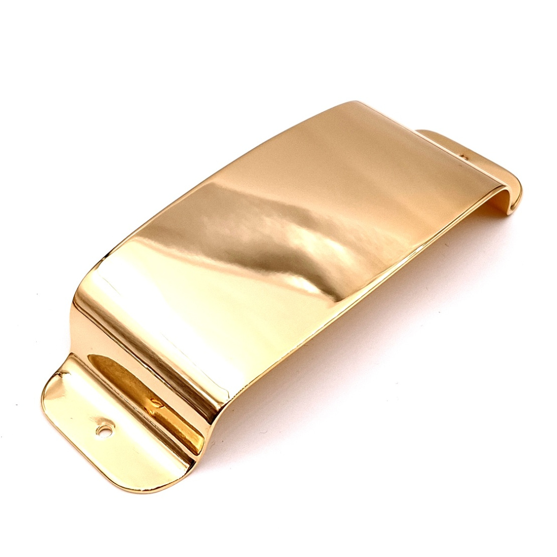 Mikrofonin peittolevy JB -tyylin bassoon, kulta. JB -style pickup cover. Max. mitat n. / max. dimensions: 51 mm x 133 mm.