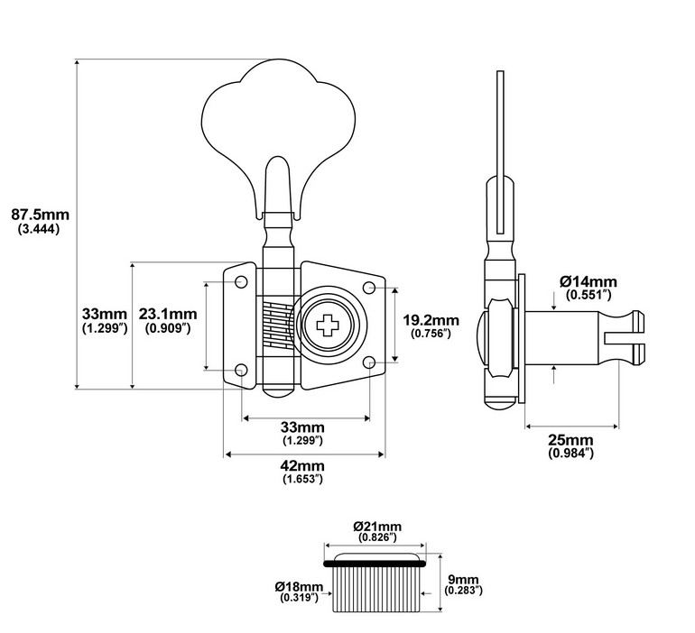 Tuning machineset for 4-string electricbass. Set includes 4L + tuner bushings and screws. Gear ratio 19:1. Axle diameter: 14.0 mm (0.551") Axle length: 31.1 mm (1.224"). Fixing hole dia. max. 18 mm. Knob width: 40.0 mm (1.575").