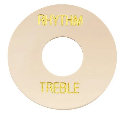 Tuote 102414. LP -tyylisen kitaran muovinen kytkimen peitelevy. Plastic switch plate. Out dia. 34.3 mm (1.350"), hole dia. 12.8mm (0.504"). With rhythm / treble text. Cream (Ivory).