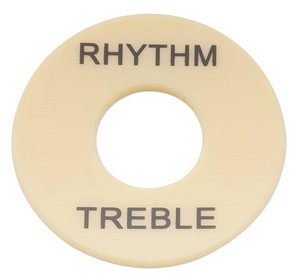 Tuote 109882. LP -tyylisen kitaran muovinen kytkimen peitelevy. Plastic switch plate. Out dia. 34.3 mm (1.350"), hole dia. 12.8mm (0.504"). With rhythm / treble text. Cream (Ivory).
