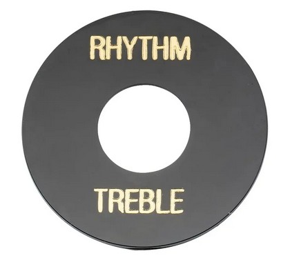 Tuote 102415. LP -tyylisen kitaran muovinen kytkimen peitelevy. Plastic switch plate. Out dia. 34.3 mm (1.350"), hole dia. 12.8mm (0.504"). With rhythm / treble text. Black.