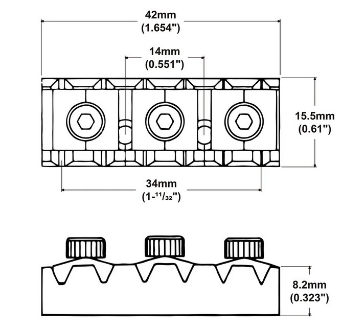 Kieltenohjain, pit. 46,5mm, kiinnitysväli 30.0 mm, reiät 2.40 mm. Ruuvit mukana. Tension bar string retainer, length 1.78", hole spacing 1.181", hole dia. 0.094".