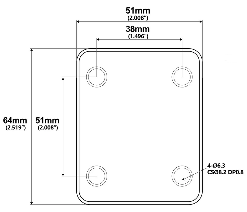 Screw holes for 4 flat or oval head, screws dia. 6.3 mm (0.248").